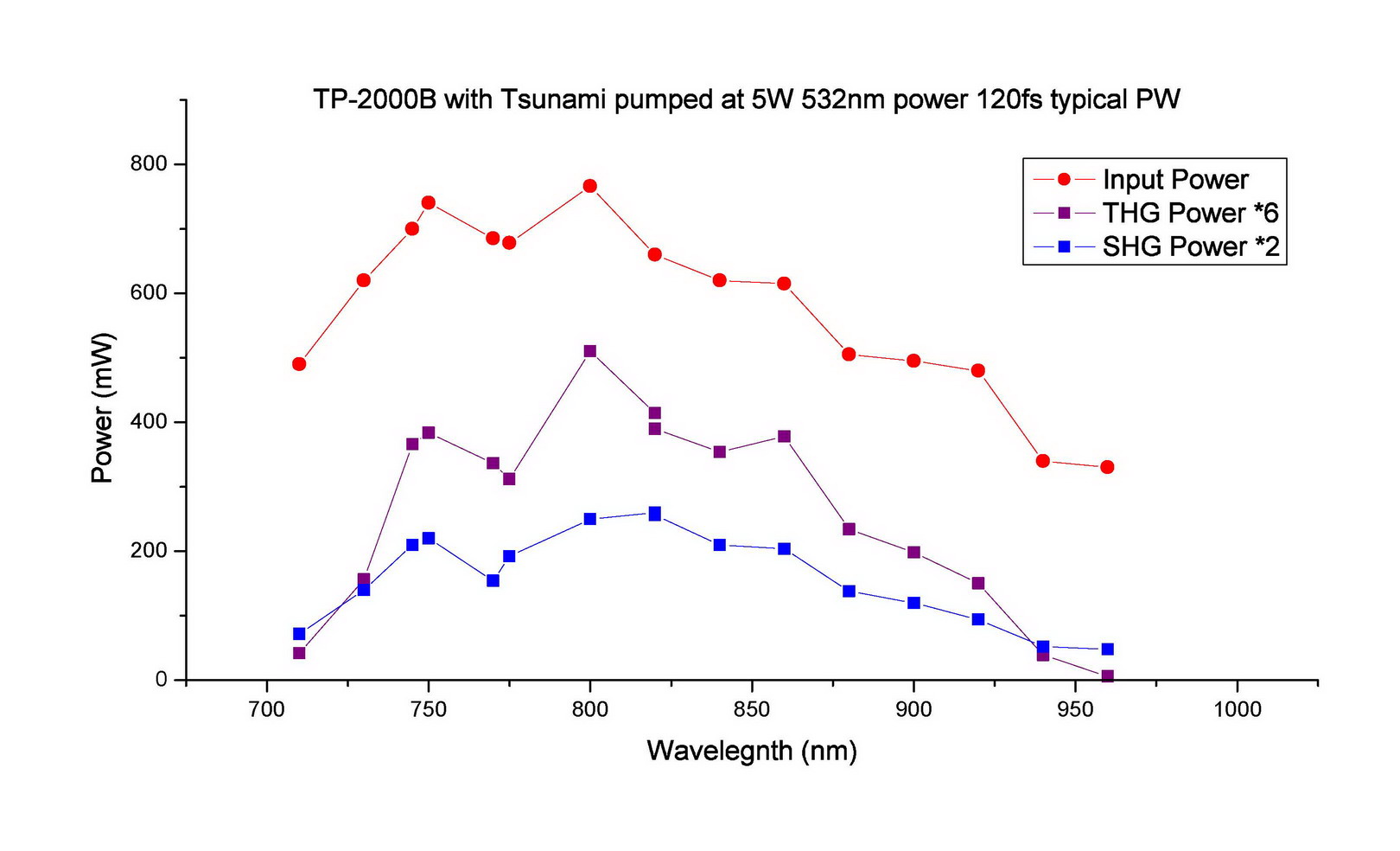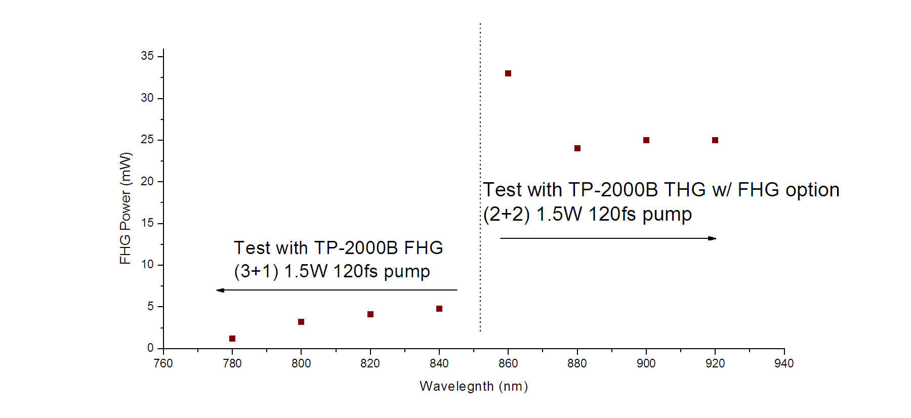 Note: Tests are done with a 100fs pulse width Ti:Sapphire oscillator, operating at 80MHz repetition rate.